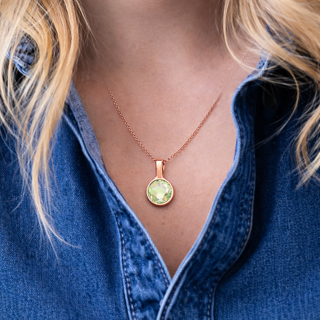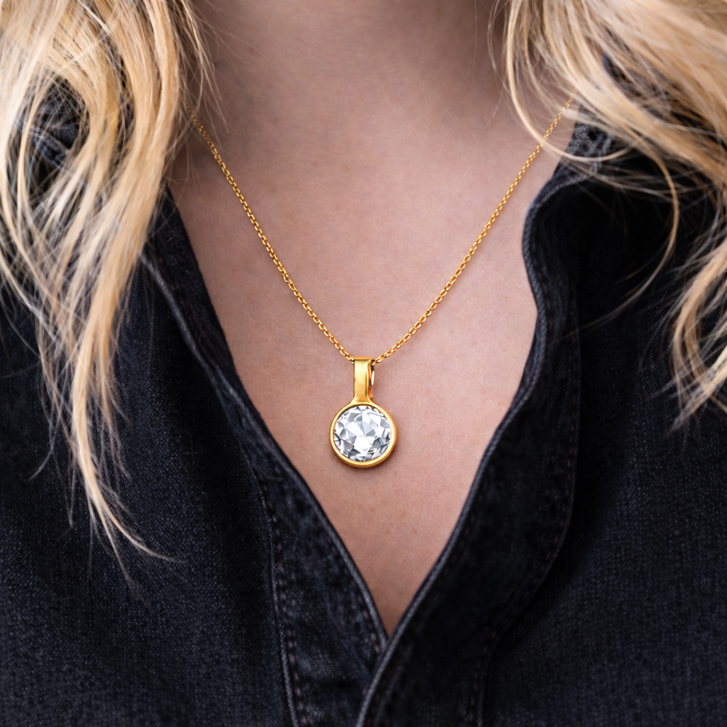 Our jewellery features gold and rose gold PVD plating, polished stainless steel, and crystals. Store flat in the original pouch or box.