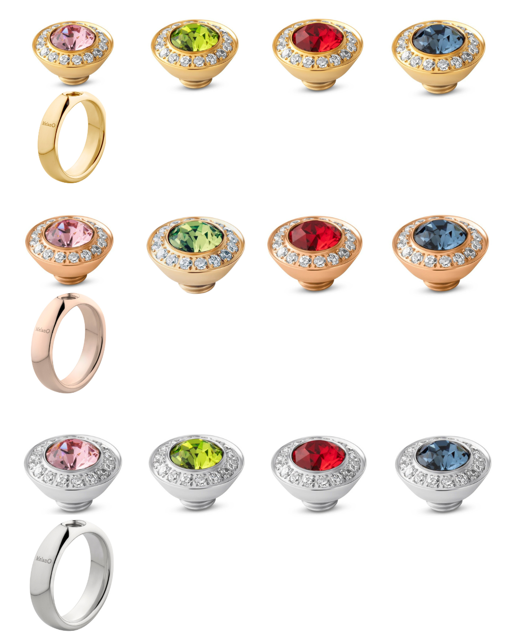 Setting tops feature Cubic Zirconia (CZ) crystals and gemstones.